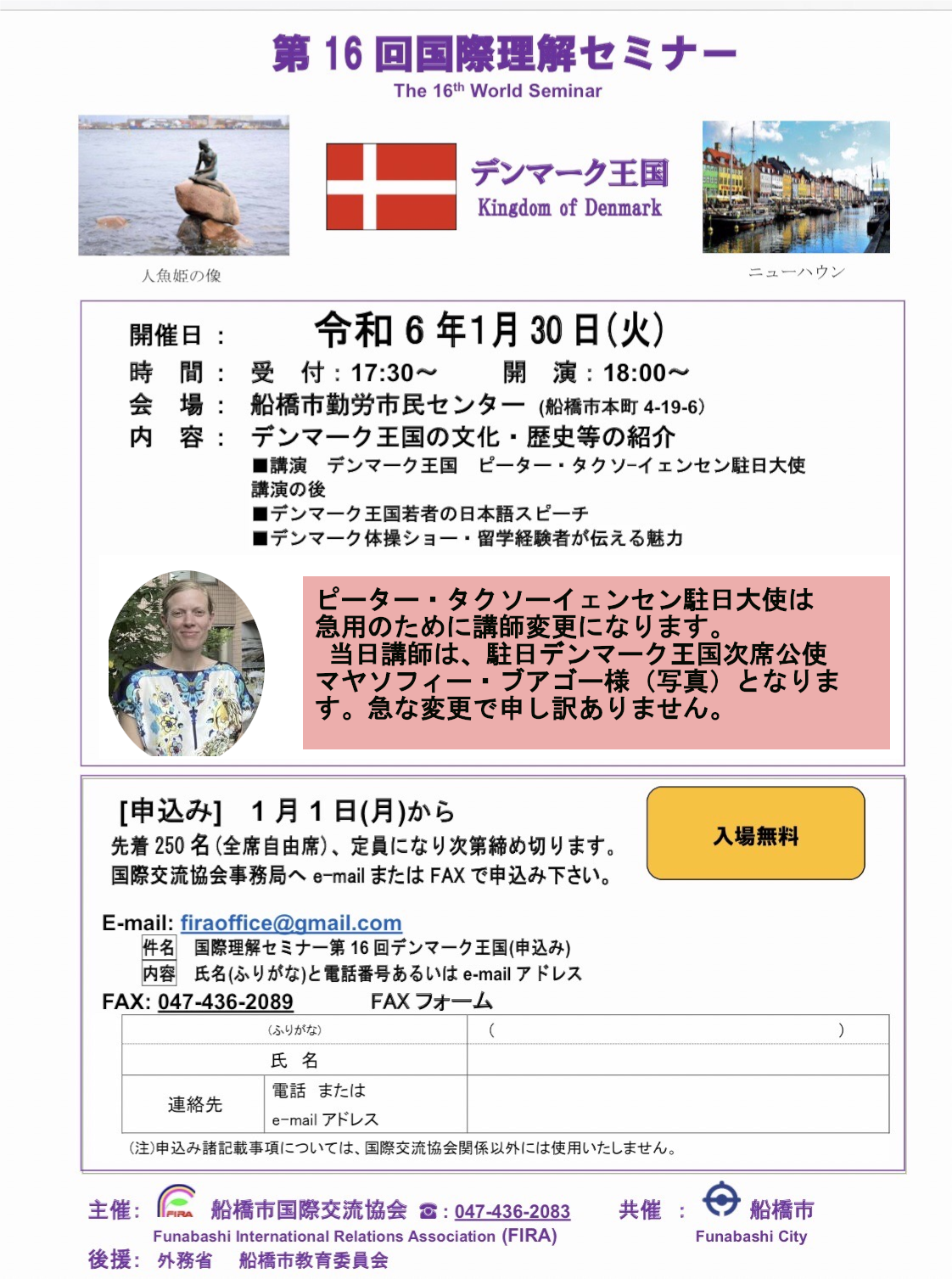 1月30日(火)船橋市民勤労センター(船橋市本町4-19-6)で船橋市国際交流協会主催の第16回国際理解セミナー「デンマーク王国」が開催された。