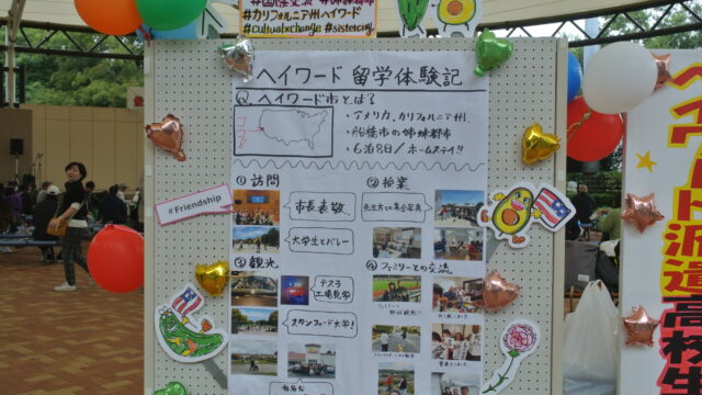 米国ヘイワード市に短期留学した高校生の展示ブースでは、高校生たちが