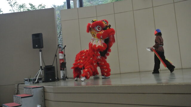 傘の色と形が素敵でした。ベトナムの獅子舞、2人舞で縦になるとものすごく