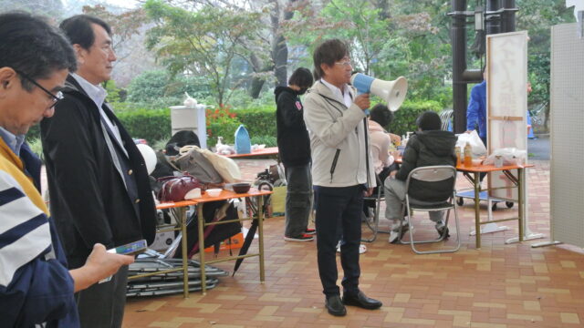 船橋市国際交流協会副会長で実行委員長の小田原隆泰さんが、雨天の中