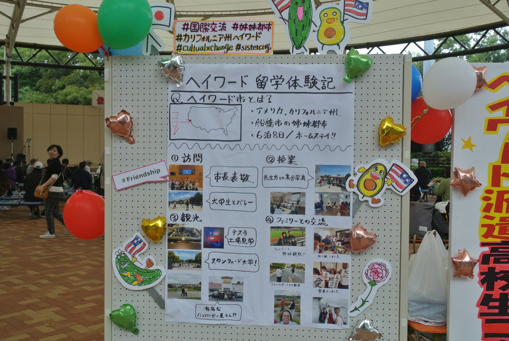 米国ヘイワード市に短期留学した高校生の展示ブースでは、高校生たちが
