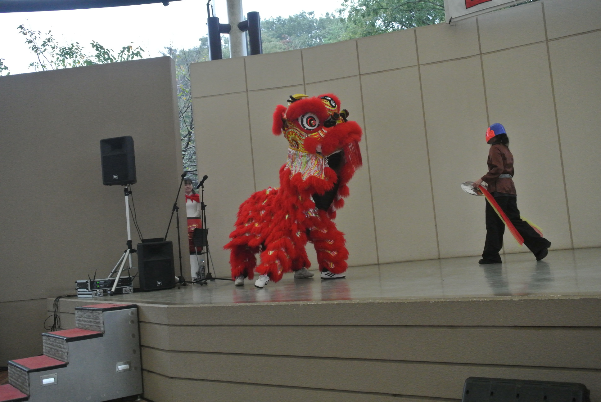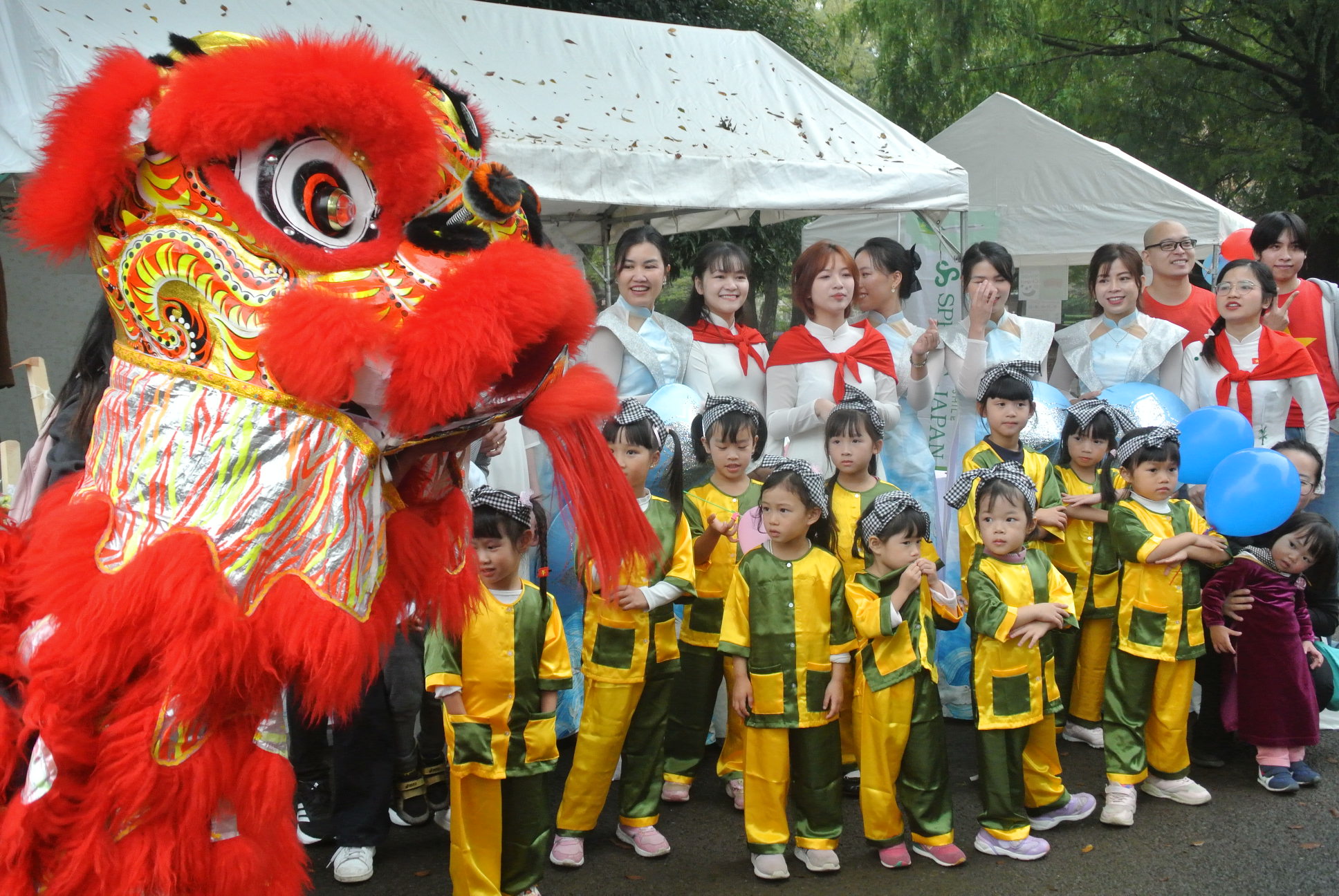 傘の色と形が素敵でした。ベトナムの獅子舞、2人舞で縦になるとものすごく